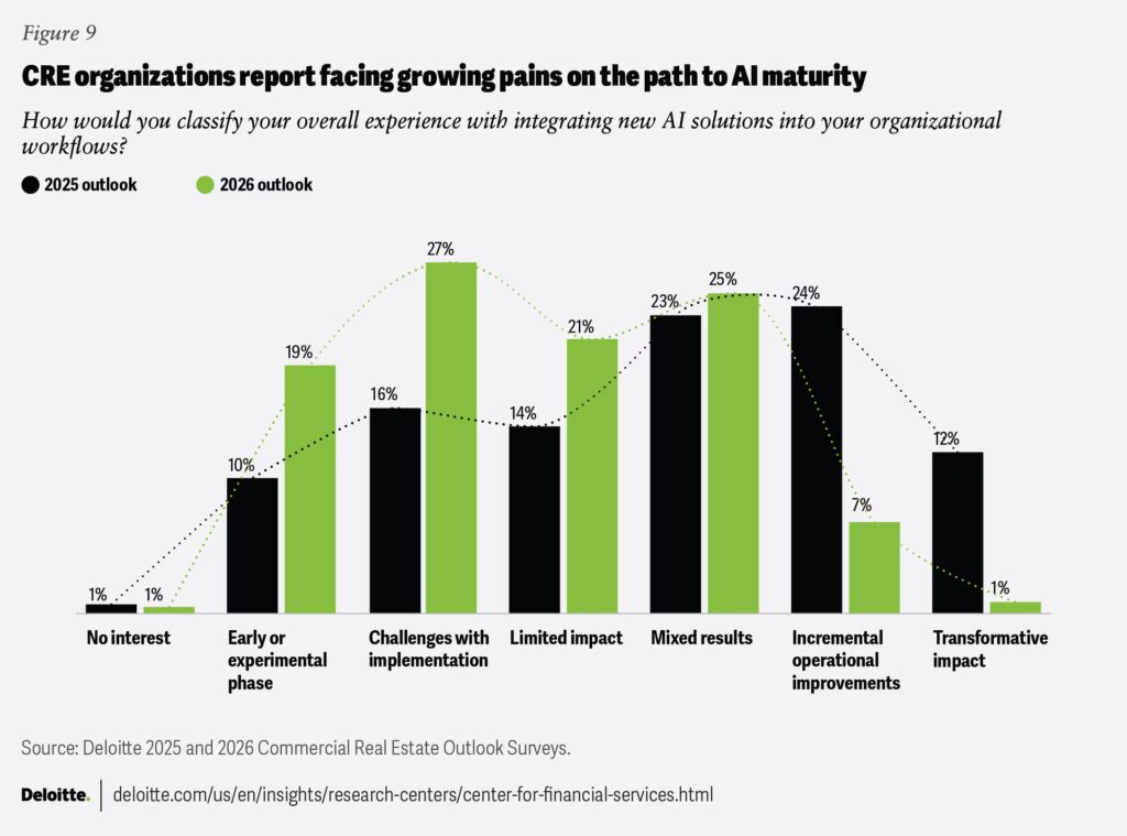 In Deloitte’s 2026 Commercial Real Estate Outlook, nearly one in five leaders said their firm is still in the early stages of AI adoption, and more than a quarter report challenges like lack of expertise, integration issues, or resistance to change.